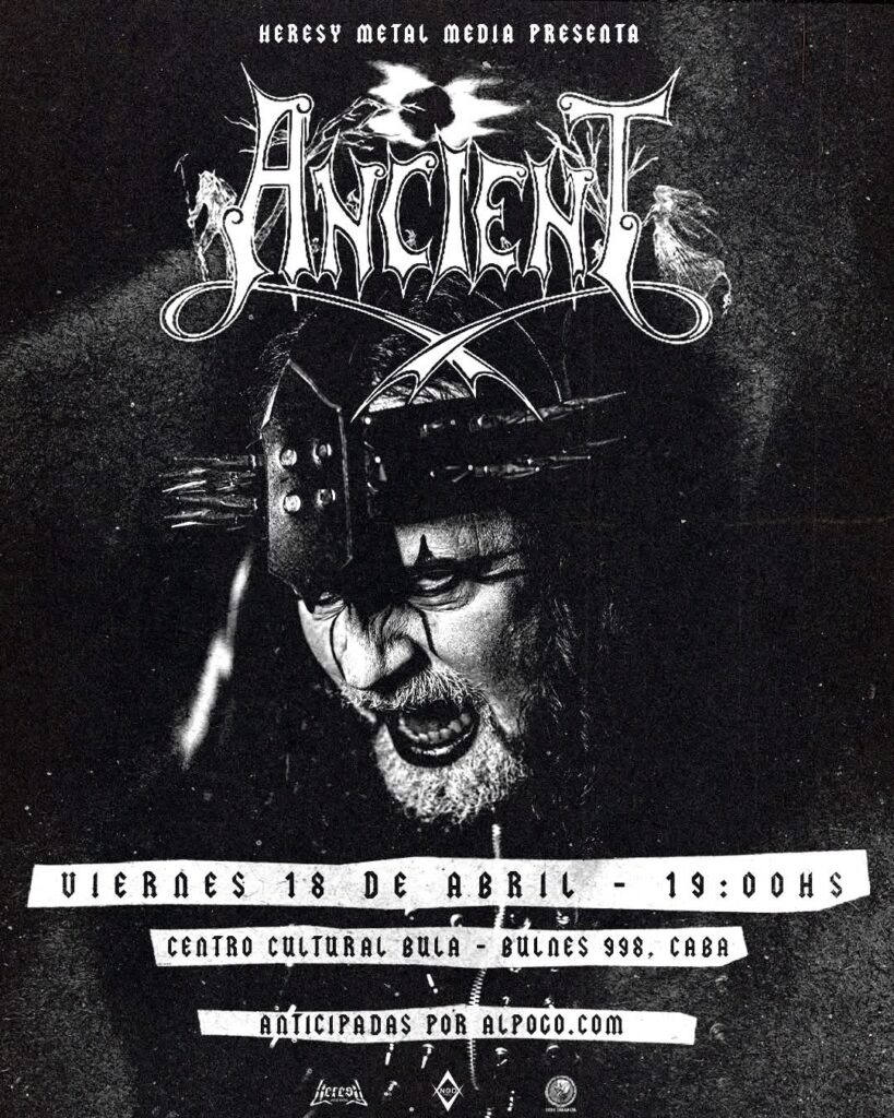 ANCIENT se presentará el viernes 18 de abril en Club Cultural BULA (Bulnes 998, CABA), junto a tres bandas nacionales que representan lo mejor del black y death metal local: DIOS SERPIENTE, RHAUG y GLORIAM SATANAS. La noche será un verdadero ritual sonoro y visual, con corpsepaint, atmósferas rituales y un público devoto que hace décadas espera este momento.