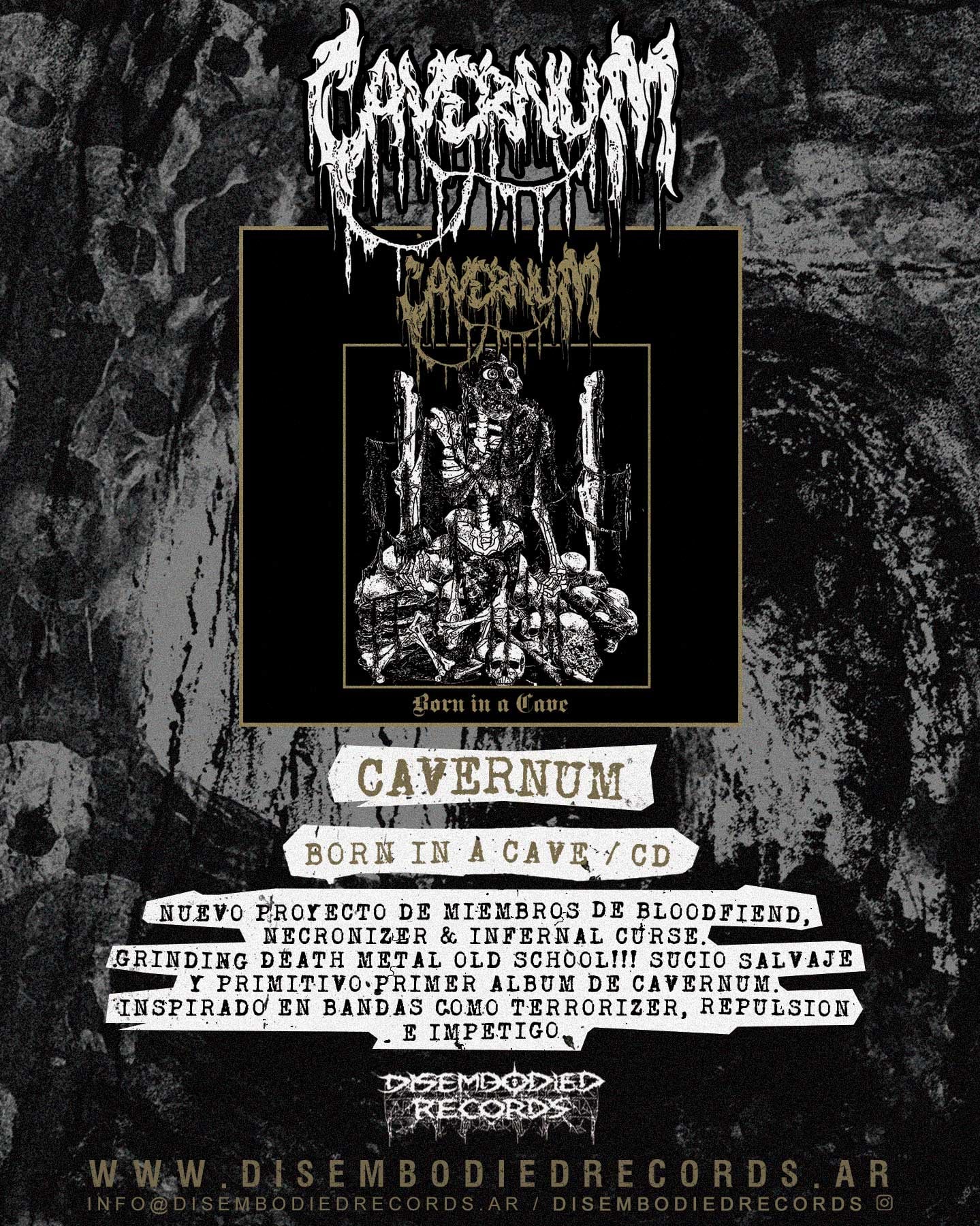 En 26′ de puro Death Metal estampado bajo patrones Europeos, el desempeño de las composiciones es muy bueno. Sólidos y densos riffs primitivos del género, una voz putrefacta, bien de ultratumba y sólidas bases de bajo y batería. Un doble bombo que no cesa en medio de la podredumbre reinante es lo que es “Born in a Cave”, el álbum debut de CAVERNUM y que ya se encuentra disponible desde este año, desde el mes de junio. Fue editado por sello Argentino Disembodied Records, que dicho sea de paso, es un sello especializado del rubro que se ha dedicado durante años a fomentar el crecimiento del género que hoy nos ocupa en la placa, así como de otras más extremas.
