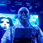 Bizarre Cosmic Industries continuó el viaje, sumando densidad y un aura mecánica. Riffs hipnóticos, teclados industriales envolventes y la interacción con el público generaban un vínculo inmediato. En Planetarium, los matices sinfónicos se acentuaron con la iluminación azulada y violeta, mientras Sarah lanzaba miradas de desafío y seducción. Durante esta primera parte del show, las letras de COVENANT reforzaron la atmósfera épica y cósmica de la música. Los temas de Nexus Polaris abordaban conceptos como viajes espaciales, guerras cósmicas, dragones y entidades poderosas, combinando mitología, ciencia ficción y simbolismo. Esta carga temática, sumada a la teatralidad de la banda, generaba un universo narrativo propio, donde cada canción funcionaba como un capítulo de una historia mayor, invitando al público a sumergirse en un clima tanto épico como ominoso.