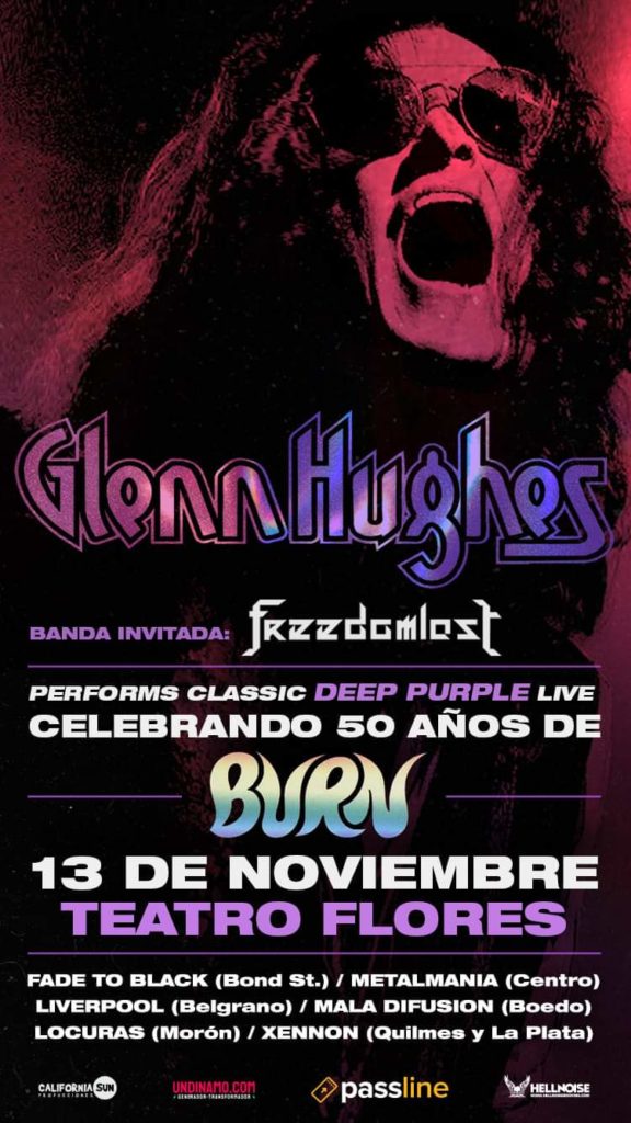 FREEDOMLOST estará tocando junto a GLENN HUGHES en Flores el próximo 13 de noviembre en lo que será la celebración de los 50 años de “Burn”. Se espera un recinto lleno, con lo cual, la banda bonaerense tendrá la chance de mostrarse junto a cientos de fans acérrimos a la propuesta hard rockera que practica esta moderna agrupación que posee pocos años de vida.