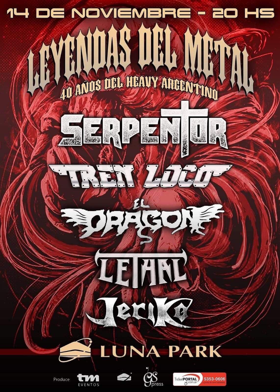 OM: – En principio debe saberse que EL DRAGÓN por mi intermedio fue la banda que puso la idea para hacer el “Leyendas”, consiguió el Luna Park y al productor para producirlo. Además propusimos que bandas serían las ideales para participar respetando la cantidad en función del tiempo disponible. No entraban más. Agradezco a TREN LOCO, LETHAL, JERIKO y a SERPENTOR por apoyar el proyecto, por participar y conformar un bloque unido, todos por igual sin egoísmo. EL DRAGÓN aporta su espíritu de lucha, su visión under, su combatividad, sus contactos, su idea de unión, la solidaridad, no nos guardamos nada. EL DRAGÓN tiene la felicidad y el orgullo de pertenecer a una secta de músicos, que salga como salga el concierto seremos históricamente los primeros en llevar en forma de festival, el heavy metal al Luna Park. Musicalmente aportamos nuestra identidad específica consistente en una música con un estilo particular, poderoso, que destila energía, que es ligera, que tiene un coctel de arreglos con thrash, hard, clásico, jazz, blues, sinfónico, rock, etc., con mucho mensaje literario. No intentamos sonar o ser parecidos a METALLICA, IRON MAIDEN, JUDAS, etc., somos EL DRAGÓN, sonamos como EL DRAGÓN y eso es suficiente.