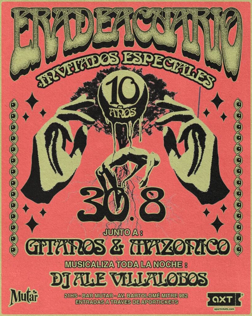 Diez años no es poco para una banda emergente hoy en día. Es por eso que ERA DE ACUARIO, banda de stoner/alternativo radicada en la Zona Sur de Buenos Aires, tirará la casa por la ventana el sábado 31 de agosto en Bar Mutar, el escenario más caliente de Avellaneda según reza el lema, junto a bandas invitadas y amigas de la talla de GITANOS y MAZÓNICO, además de contar con la musicalización durante toda la noche con full vinilos de parte de DJ ALE VILLALOBOS.