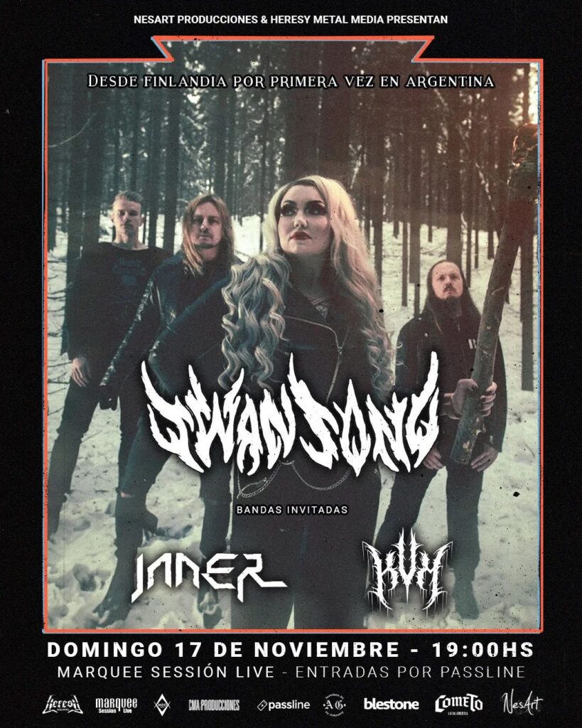 El próximo domingo 17 de noviembre, SWANSONG, desde Finlandia llegará por primera vez a nuestro país para presentar su formidable propuesta musical, en un blend de death metal melódico con sinfónico y temáticas de horror, no solo en lo lírico, sino también con la puesta en escena. Actualmente, están presentando su primer disco Awakening lanzado por Noble Demon y estarán tocando en Chile en el marco del concurso Come to Latin America, por lo que decidieron venir a nuestro país para conocer Buenos Aires y su público, acompañados por KVM, INNER y BLACKTORCH.