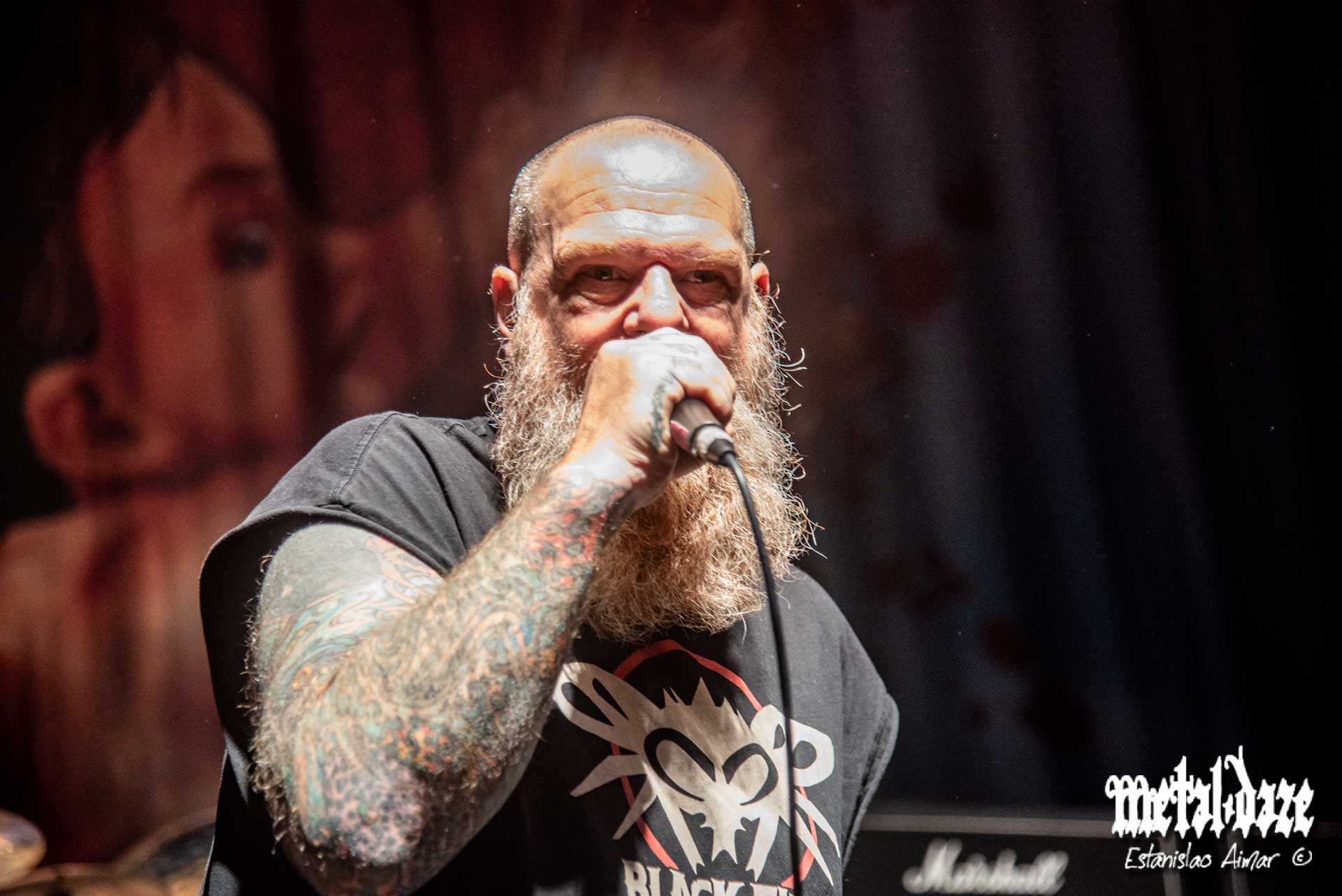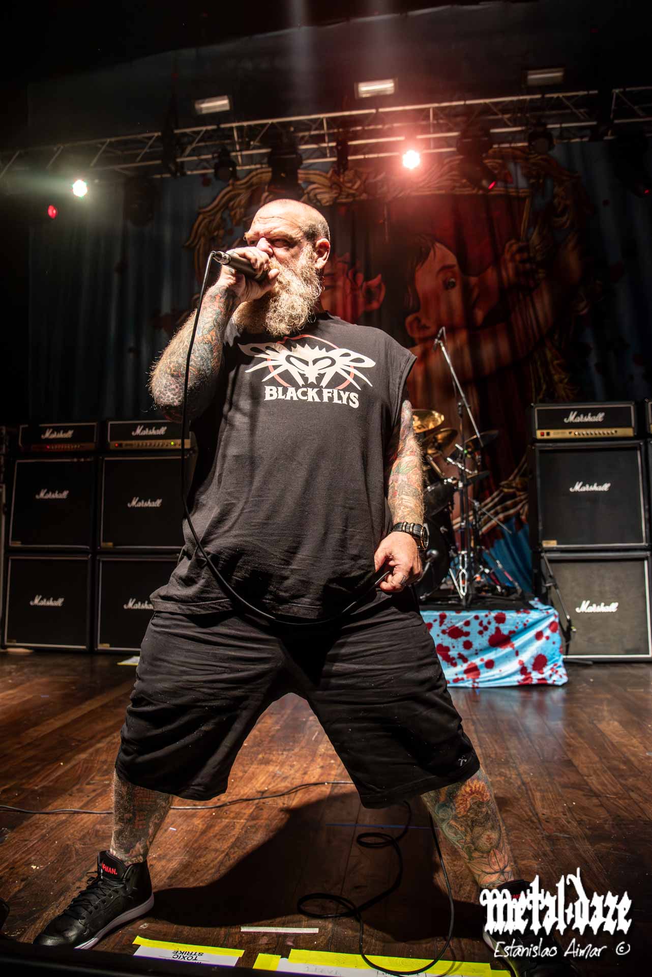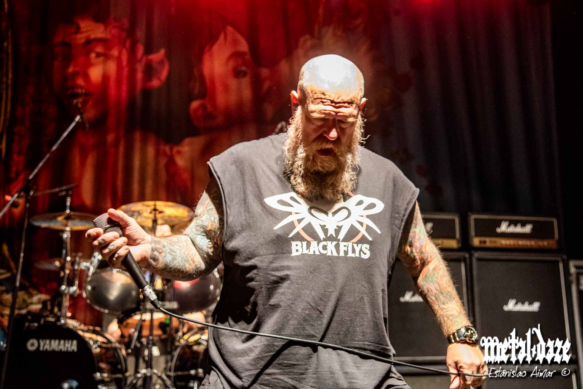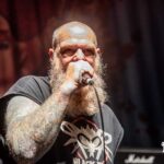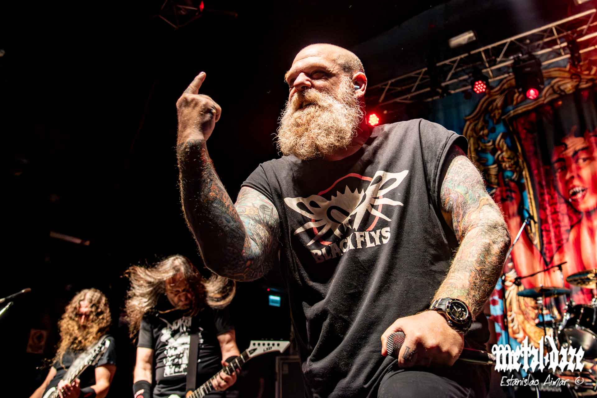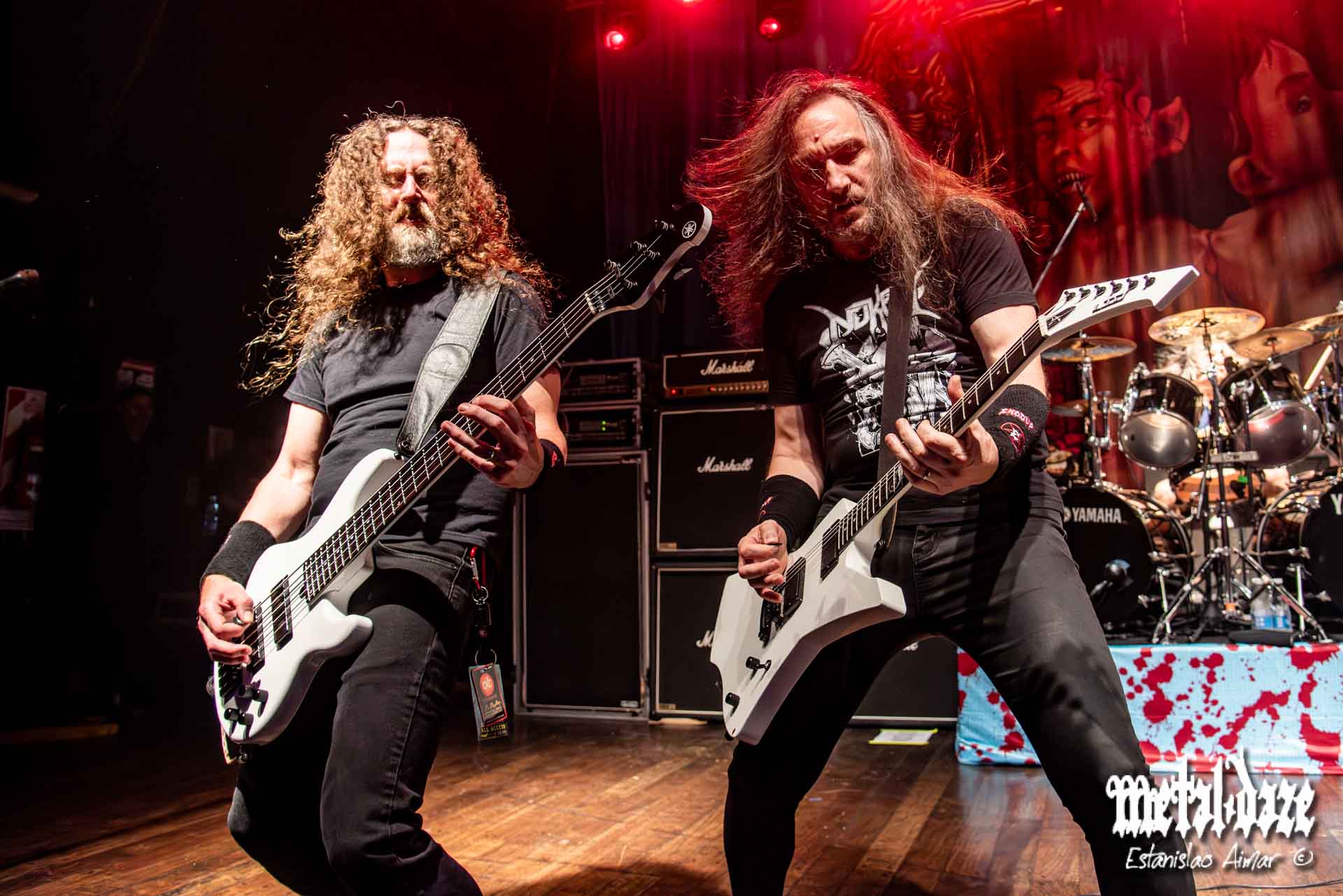 Cuarenta años después de Bonded by Blood, EXODUS ofreció en el Teatro Flores algo mucho más significativo que un concierto conmemorativo: una clase abierta sobre cómo se construye, se sostiene y se actualiza la gramática del thrash metal. El regreso de Rob Dukes al micrófono reactivó una de las etapas más sólidas del grupo y devolvió a su sonido una densidad expresiva que había quedado grabada en los discos más técnicos y oscuros de la banda. Su voz, grave, cortante y precisa, funcionó como el verbo central de esa gramática: una forma de nombrar la furia y dotarla de sintaxis. A su lado, Gary Holt y Tom Hunting, los dos sobrevivientes de la formación original, fueron la puntuación que sostiene el discurso: el primero con riffs que articulan sentido más allá de la velocidad, y el segundo marcando la cadencia exacta de una lengua que se golpea y se repite hasta encontrar su verdad. Ambos demostraron que el thrash, más que un género, es un sistema de signos que se escribe con cuerpo, sudor y disciplina.
