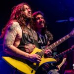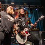 El momento más simbólico llegó durante And Then There Were None, justo antes de la parte más veloz. Holt y Dukes se acercaron al centro del escenario, intercambiaron una mirada cómplice y chocaron los puños con violencia, como dos gladiadores que reconocen el inicio del combate. Ese gesto, breve pero cargado de electricidad, condensó el espíritu de la banda: respeto, camaradería y furia compartida. Lo que siguió fue una detonación, una descarga de velocidad y precisión que hizo vibrar hasta las columnas del teatro. La agitación de Dukes fue inmediata: arengaba al público con movimientos de brazos, desafiándolos a romper la quietud, y el resultado fue uno de esos pogos que parecen una carnicería, un torbellino de cuerpos empujándose entre sí como si el suelo ardiera. No había distancia entre el escenario y la multitud; todo era un mismo bloque de energía desbordada. En ese clima de frenesí, A Lesson in Violence emergió como un himno de supervivencia.