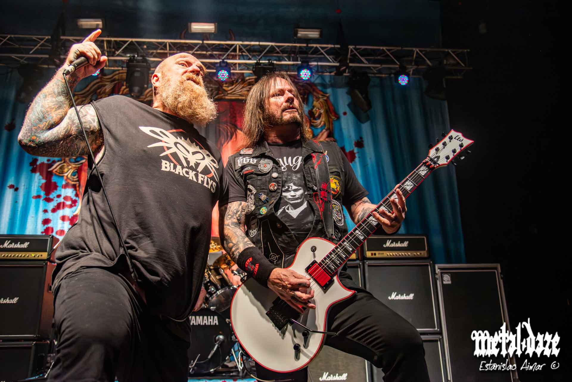 El Teatro Flores, rendido ante el estruendo, se transformó en una cámara de combustión. Lo que en Bonded by Blood nació como furia juvenil, ahora era una máquina calibrada: un choque de precisión sobre la rabia primigenia. Gary Holt, concentrado y meticuloso, dirigió cada riff con autoridad, mientras Tom Hunting mantenía el pulso como un martillo neumático. Y en el centro del escenario, Rob Dukes imponía su figura monumental. Hay algo en su presencia que excede el rol de frontman: es una especie de agitador del mal, un catalizador de energía oscura. Con solo una mirada logra que la gente se prenda fuego. Su gesto, entre el desafío y la sonrisa perversa, enciende a la multitud como si liberara una descarga invisible. Holt lo observa desde su rincón y sonríe: sabe perfectamente de ese poder, lo conoce, lo mide y lo disfruta. El momento más simbólico llegó durante And Then There Were None, justo antes de la parte más veloz. Holt y Dukes se acercaron al centro del escenario, intercambiaron una mirada cómplice y chocaron los puños con violencia, como dos gladiadores que reconocen el inicio del combate. Ese gesto, breve pero cargado de electricidad, condensó el espíritu de la banda: respeto, camaradería y furia compartida. Lo que siguió fue una detonación, una descarga de velocidad y precisión que hizo vibrar hasta las columnas del teatro. La agitación de Dukes fue inmediata: arengaba al público con movimientos de brazos, desafiándolos a romper la quietud, y el resultado fue uno de esos pogos que parecen una carnicería, un torbellino de cuerpos empujándose entre sí como si el suelo ardiera. No había distancia entre el escenario y la multitud; todo era un mismo bloque de energía desbordada. En ese clima de frenesí, A Lesson in Violence emergió como un himno de supervivencia.