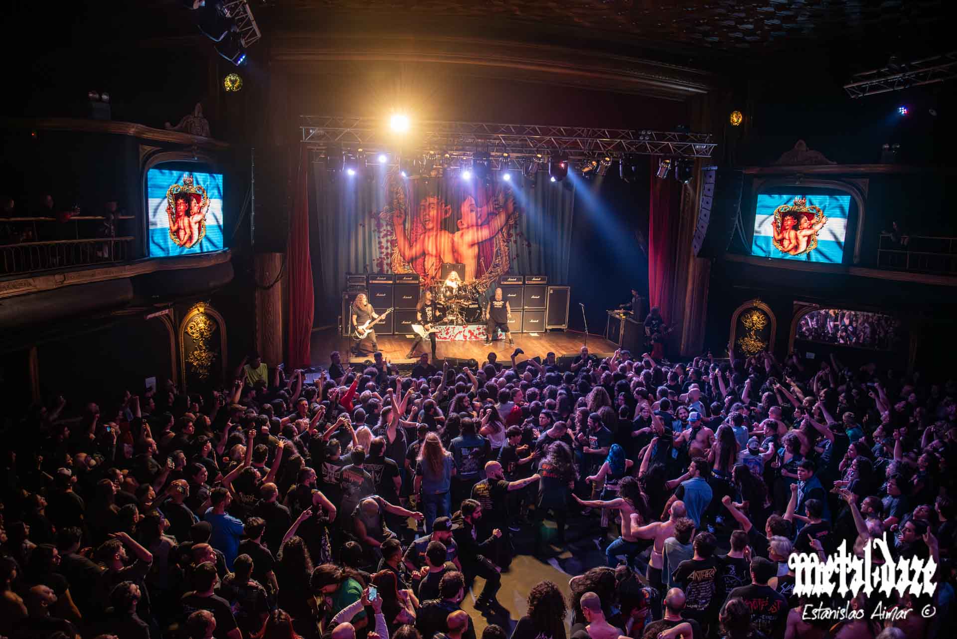 El show fue una afirmación y no un recuerdo. EXODUS tocó con la energía de una banda que todavía siente la necesidad de convencer, y lo hizo sin apelar a la nostalgia, con una precisión que no busca lucimiento, sino contundencia. Cada tema funcionó como una frase dentro de un texto mayor, un texto que lleva cuarenta años escribiéndose sobre escenarios, discos y cicatrices. El público, lejos de comportarse como testigo, fue parte activa de esa escritura colectiva: cada pogo, cada coro, cada golpe de puño al aire fue una marca más en la página infinita del thrash. Mientras muchas bandas de su generación repiten la estructura del recuerdo, EXODUS eligió la tarea más difícil y noble: seguir redactando. Y si el thrash puede entenderse como un idioma, entonces EXODUS es su gramática viva, el conjunto de reglas invisibles que hacen posible que otros hablen, griten o desafinen dentro de un orden mayor. Porque el thrash no es improvisación: es la tensión perfecta entre el caos y la forma, entre la violencia y la precisión, entre la sangre y la métrica. No hubo complacencia ni artificio, sino una demostración de coherencia estética y vital. En el Teatro Flores, EXODUS no celebró un aniversario: ejerció su propio legado con la ferocidad del presente, dictando una vez más —a volumen insoportable y con absoluta lucidez— las reglas de esa lengua que ellos mismos inventaron: la gramática de la velocidad y la violencia.