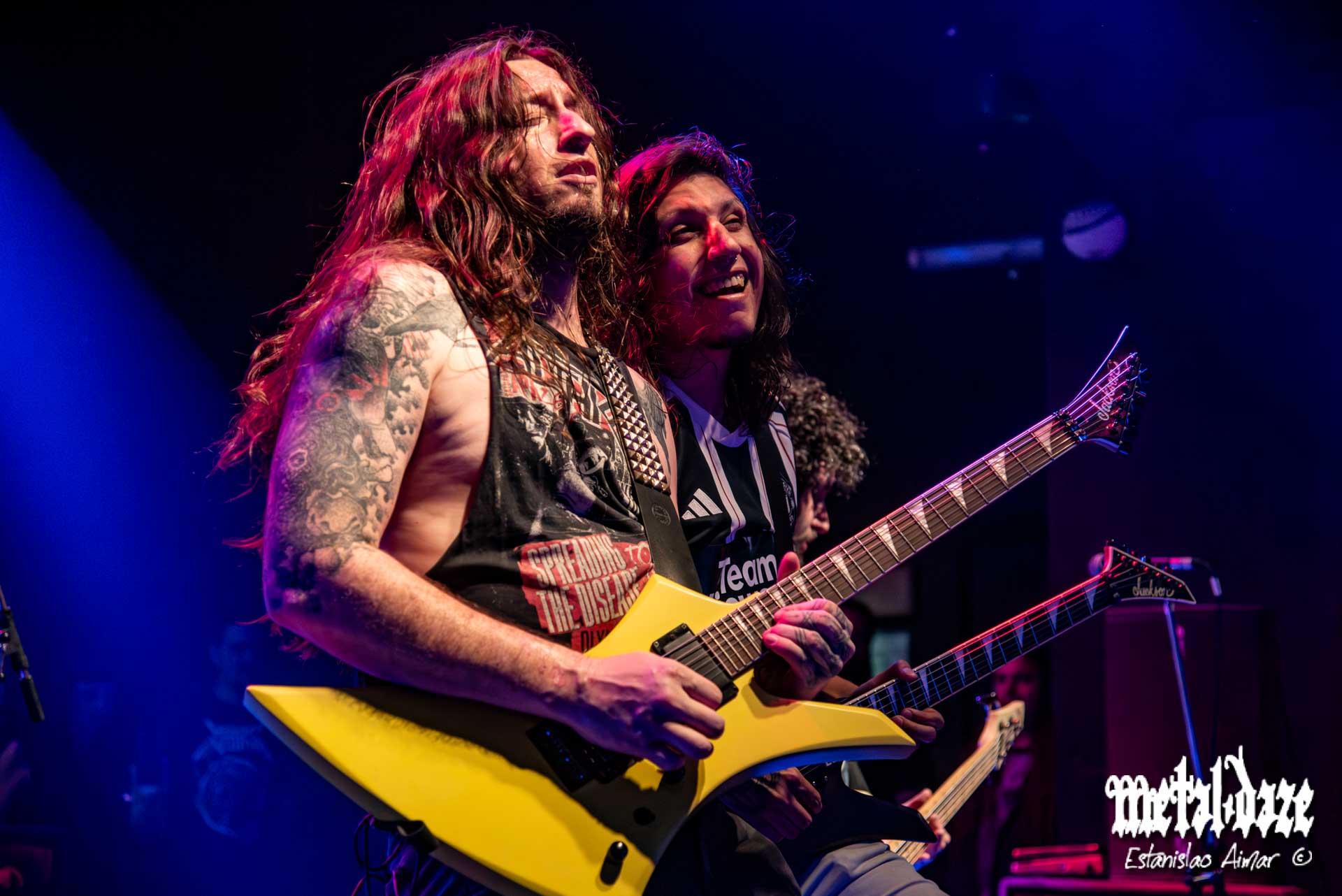 El ingreso al escenario fue tan abrupto como desconcertante. Antes de que se encendieran las luces, una grabación se filtró por los parlantes: un diálogo entre dos voces, confuso, desprolijo, carente de ritmo o intención aparente. ¿Un homenaje a la leyenda del cantante original de la banda, el ya fallecido Paul Baloff? Tal vez. Pero la pieza resultó imprecisa, un murmullo que, más que rendir tributo, generó una tensión expectante. Y justo cuando ese fragmento se apagó, el silencio se rasgó: el riff de Bonded by Blood surgió como un violento desgarro en el aire. Tras ese estallido inicial, apareció en escena una formación que llevaba impreso otro dato: Kragen Lum, guitarrista de HEATHEN al igual que Lee Altus, ocupaba uno de los puestos. Lum había reemplazado al histórico Jack Gibson por cuestiones personales y era un nombre familiar dentro del circuito thrash, incluso por haber sustituido al propio Holt cuando este debió asumir compromisos ineludibles con SLAYER. Esa presencia reforzó la idea de una banda que, lejos de repetir fórmulas, sigue en constante mutación sin perder su esencia.