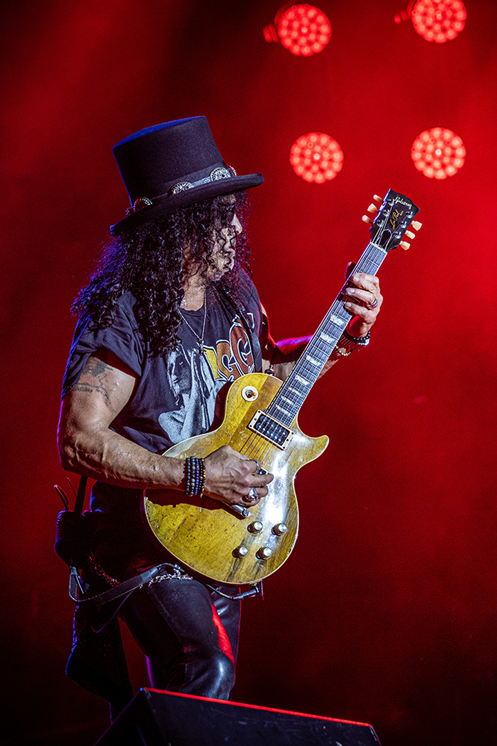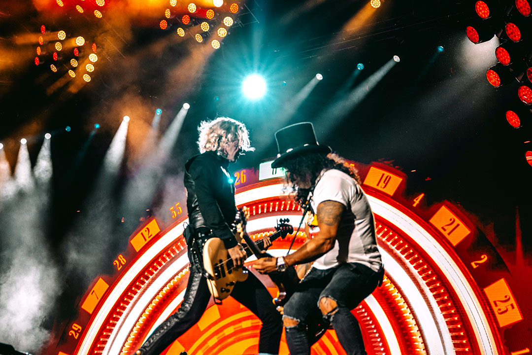 En este momento, se generó una especie de interludio que renovó el aire y cambió la energía completamente agitando aún más al público presente y despertando a quienes habían cabeceado durante la seguidilla anterior. Down on the Farm (UK SUBS), encendió la llama punk y trajo al presente aquella adrenalina adolescente que tanto hacía falta. Luego y casi sin respiro, Duff se adueñó del micrófono para entregar una vertiginosa versión de New Rose de THE DAMNED, que recordó a aquellos momentos en los que el mismo bajista interpretaba su canción Attitude,con la misma intensidad que hoy, más de 30 años después, interpretaba este himno punk. Batería rápida y certera, guitarras filosas y veloces, un bajo potente y una voz desprolija, como el punk demanda, mostraron a todos los presentes que la banda no tenía puntos débiles y que podía tocar cualquier cosa que se propusiesen. Tanto es así que para bajar las revoluciones decidieron entrar en los apenas más de diez minutos de Coma, tornando el aire denso y opresivo. A medida que la canción avanzaba el pogo se adueñó del público y un solo único y espectacularmente ejecutado coronó la canción para dar paso a la presentación de la banda y un espectacular solo de Slash que nos paseó por todos los licks clásicos del blues y destacó por el pequeño segmento que entonó del clásico de los BLUES BROTHERS Peter Gunn.