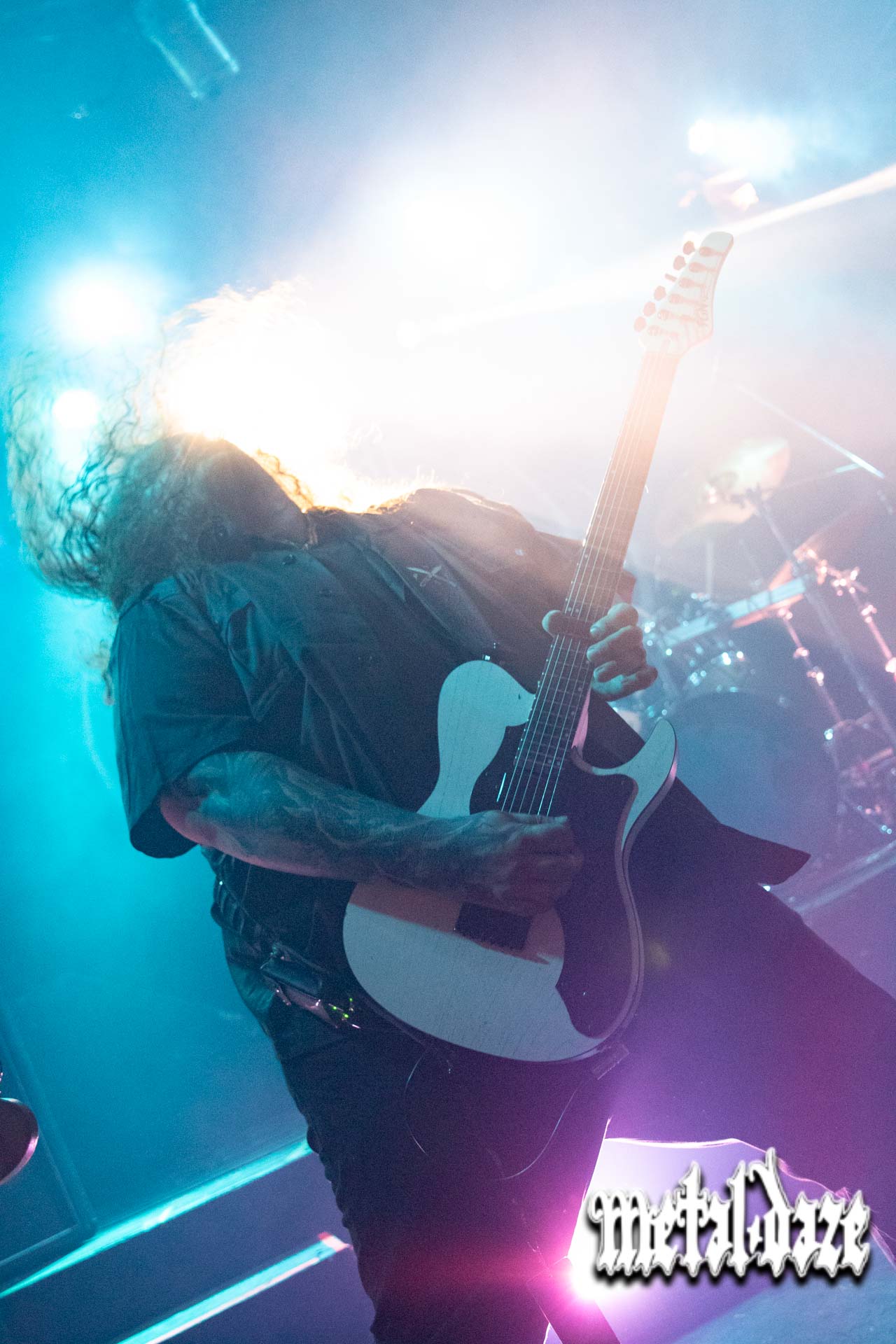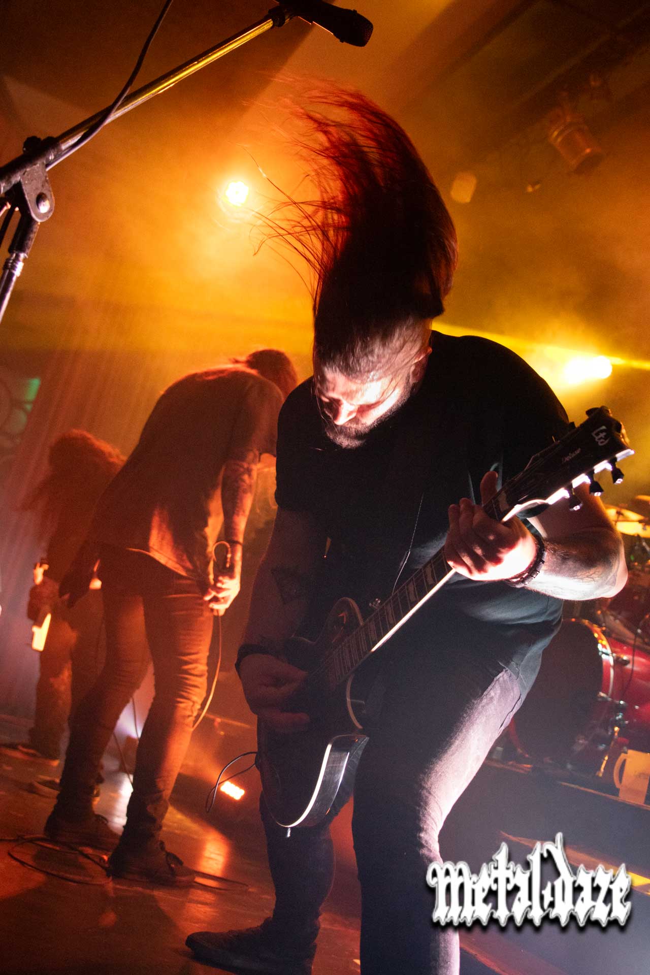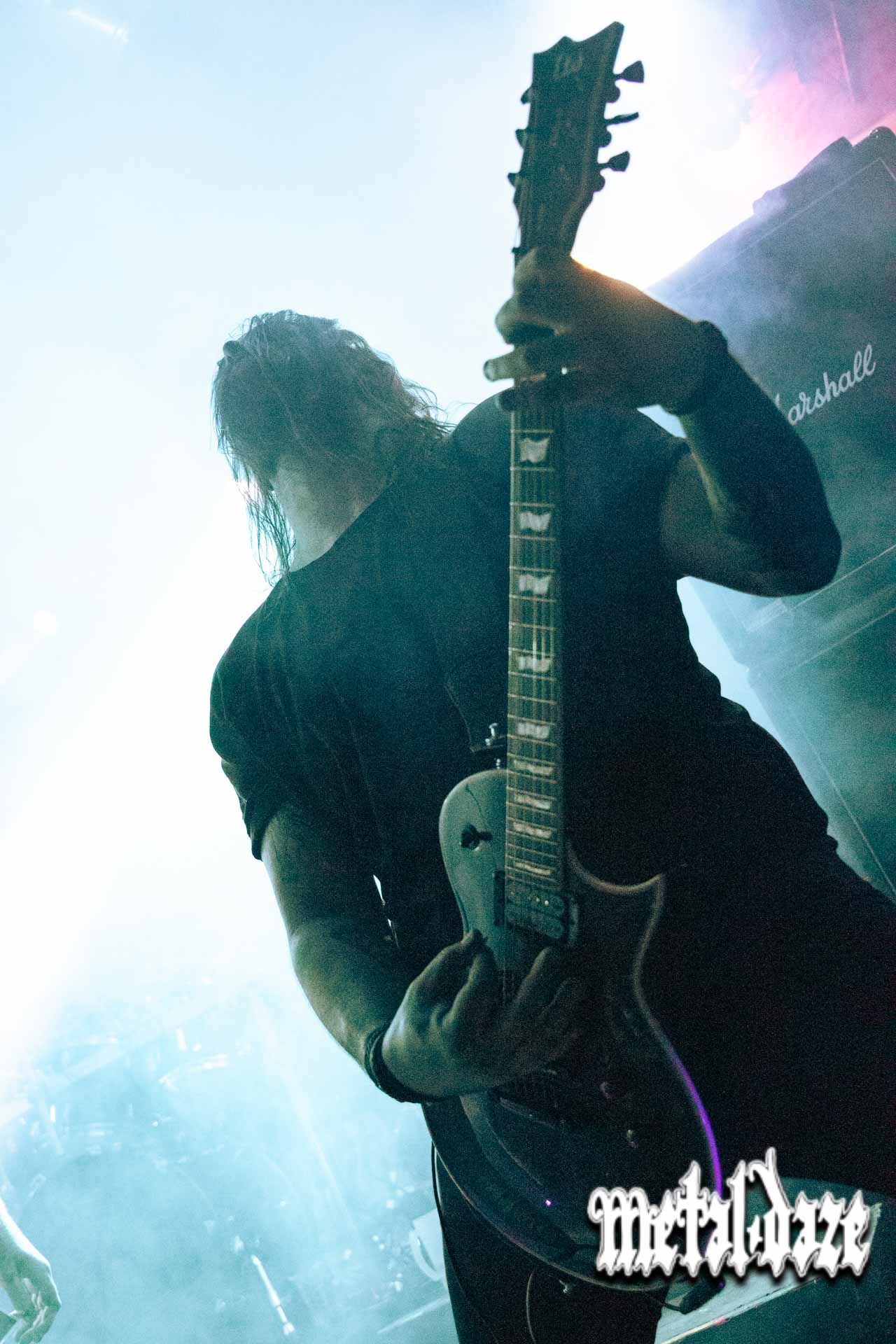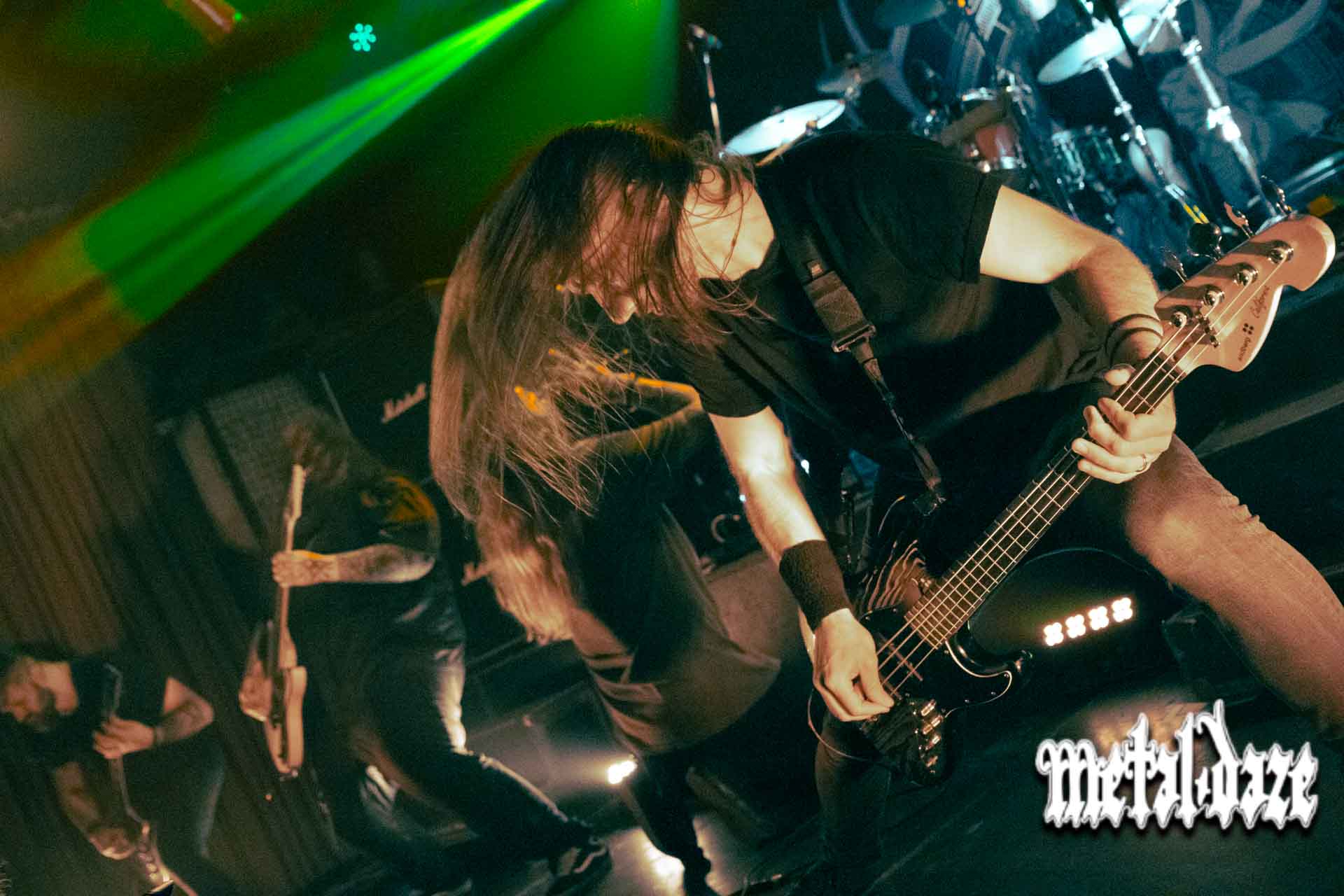 With Autumn I’ll Surrender y Funeral Dreams marcaron el momento más introspectivo. J.J. de espaldas, inmóvil en apariencia, pero vibrando con el pulso interno de las canciones, mientras Matthias Sollak desde la guitarra sostenía el equilibrio: melódico y extremo, preciso y emocional. Sollak fue el eje, el punto de gravedad que mantuvo el concierto firme cuando todo lo demás parecía a punto de derrumbarse. Las bases de teclado pregrabadas aportaron textura, profundidad y una sensación de vastedad que contrastó con el tono íntimo de la sala. El volumen, por momentos alto y saturado, añadió tensión, como si la música quisiera salirse del espacio físico que la contenía.