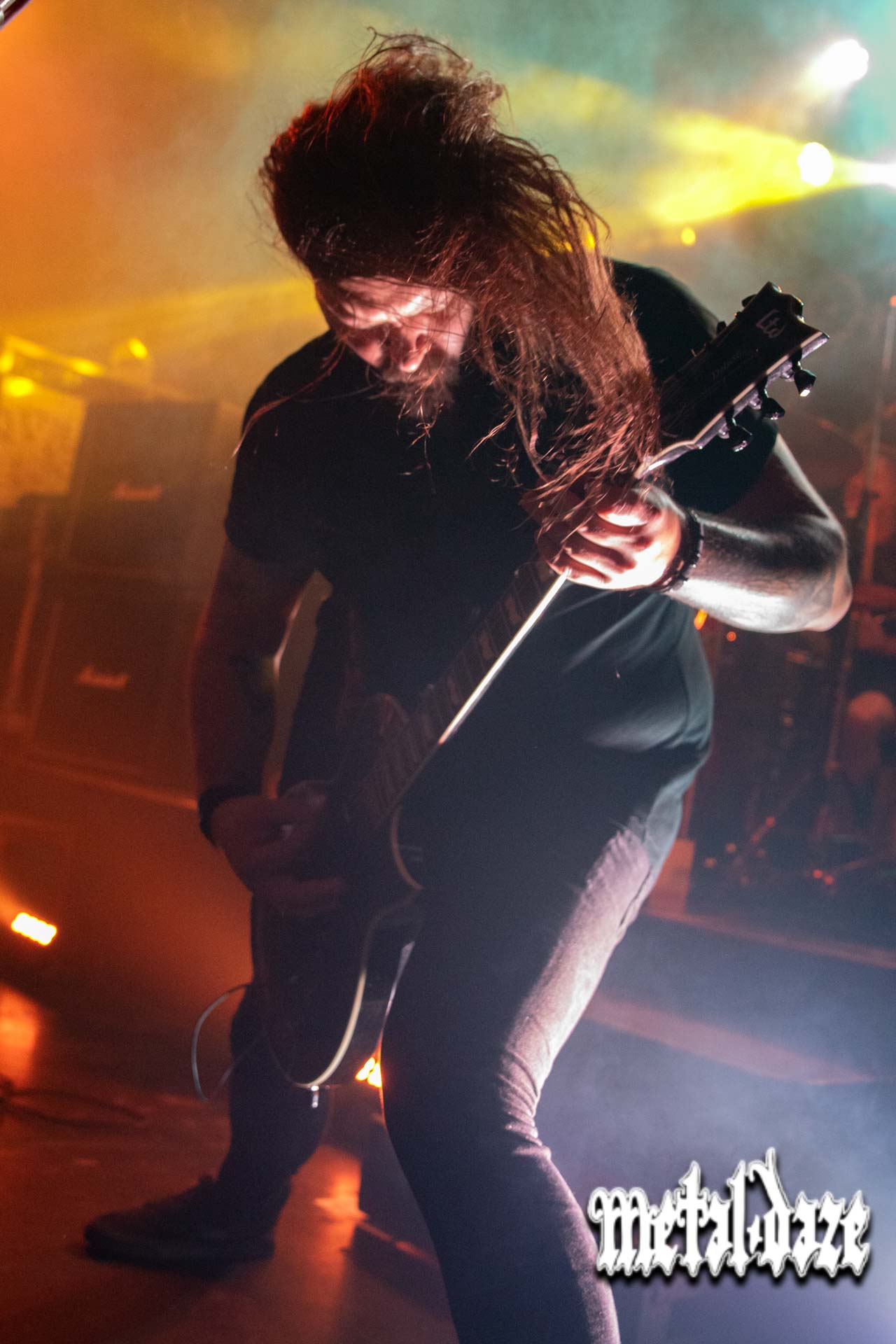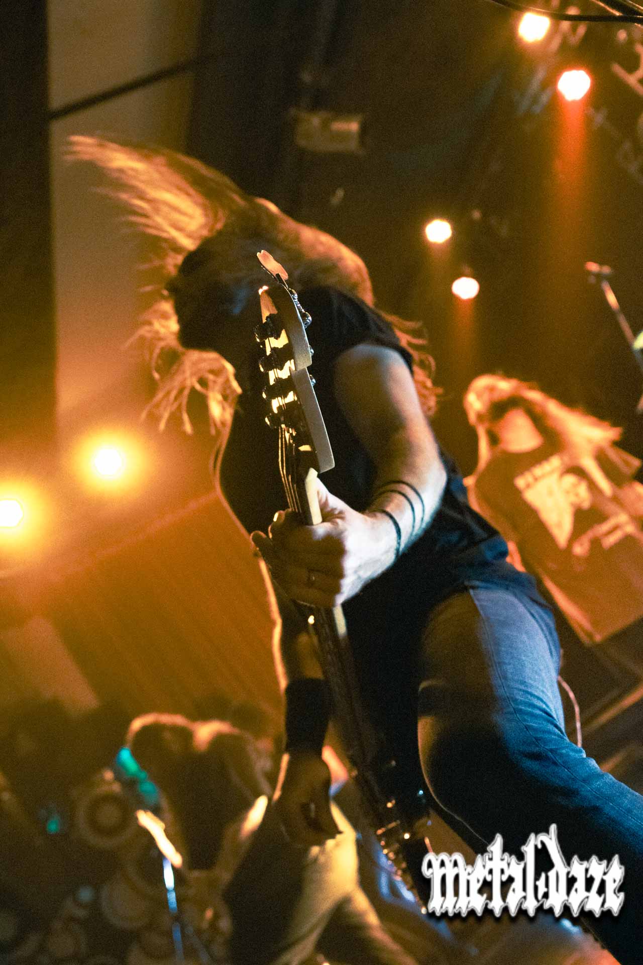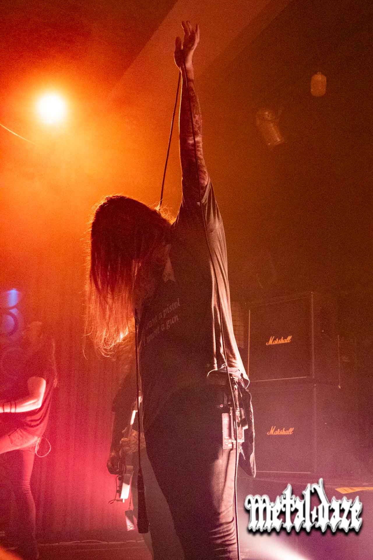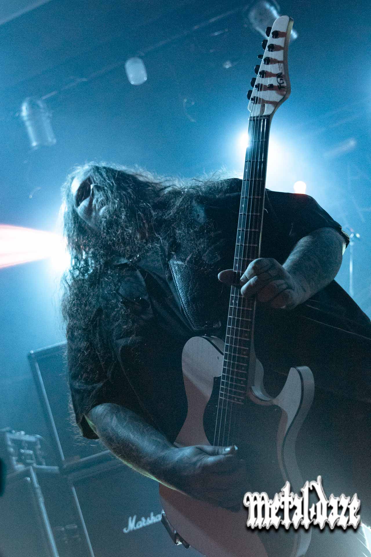 With Autumn I’ll Surrender y Funeral Dreams marcaron el momento más introspectivo. J.J. de espaldas, inmóvil en apariencia, pero vibrando con el pulso interno de las canciones, mientras Matthias Sollak desde la guitarra sostenía el equilibrio: melódico y extremo, preciso y emocional. Sollak fue el eje, el punto de gravedad que mantuvo el concierto firme cuando todo lo demás parecía a punto de derrumbarse. Las bases de teclado pregrabadas aportaron textura, profundidad y una sensación de vastedad que contrastó con el tono íntimo de la sala. El volumen, por momentos alto y saturado, añadió tensión, como si la música quisiera salirse del espacio físico que la contenía.