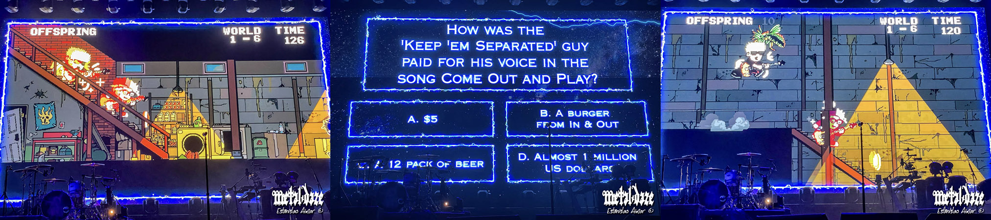 El Live Arena es un muy bonito predio con capacidad para unas nueve mil personas, pero cuyo acceso no es sencillo. Para quienes deben acceder desde la capital en transporte público, es probable que tengan que tomar al menos dos colectivos y, para quienes viajan en auto, el acceso puede resultar muy lento; tanto que, en algunos casos, se tardó casi una hora en recorrer los últimos mil metros antes de ingresar al estacionamiento del predio. Esta misma situación fue experimentada por miles de fans, lo que llevó a la organización del evento a retrasar su inicio media hora. La espera, sin embargo, fue amena, con música de fondo y varios entretenimientos en la pantalla. Desde una trivia de THE OFFSPRING que consistía en preguntas con opciones para que sus fans pudieran medir su conocimiento sobre la banda, videos de surfistas, una carrera animada de jets y hasta una animación que simulaba un videojuego de la banda, en el cual Noodles y Dexter recorrían un escenario recolectando monedas y cuyo objetivo final era rescatar al niño de la portada de Americana, que se balanceaba temeroso al final del recorrido. Finalmente, faltando 5 minutos, un enorme reloj comenzó una cuenta regresiva y ya nada sería igual esa noche.