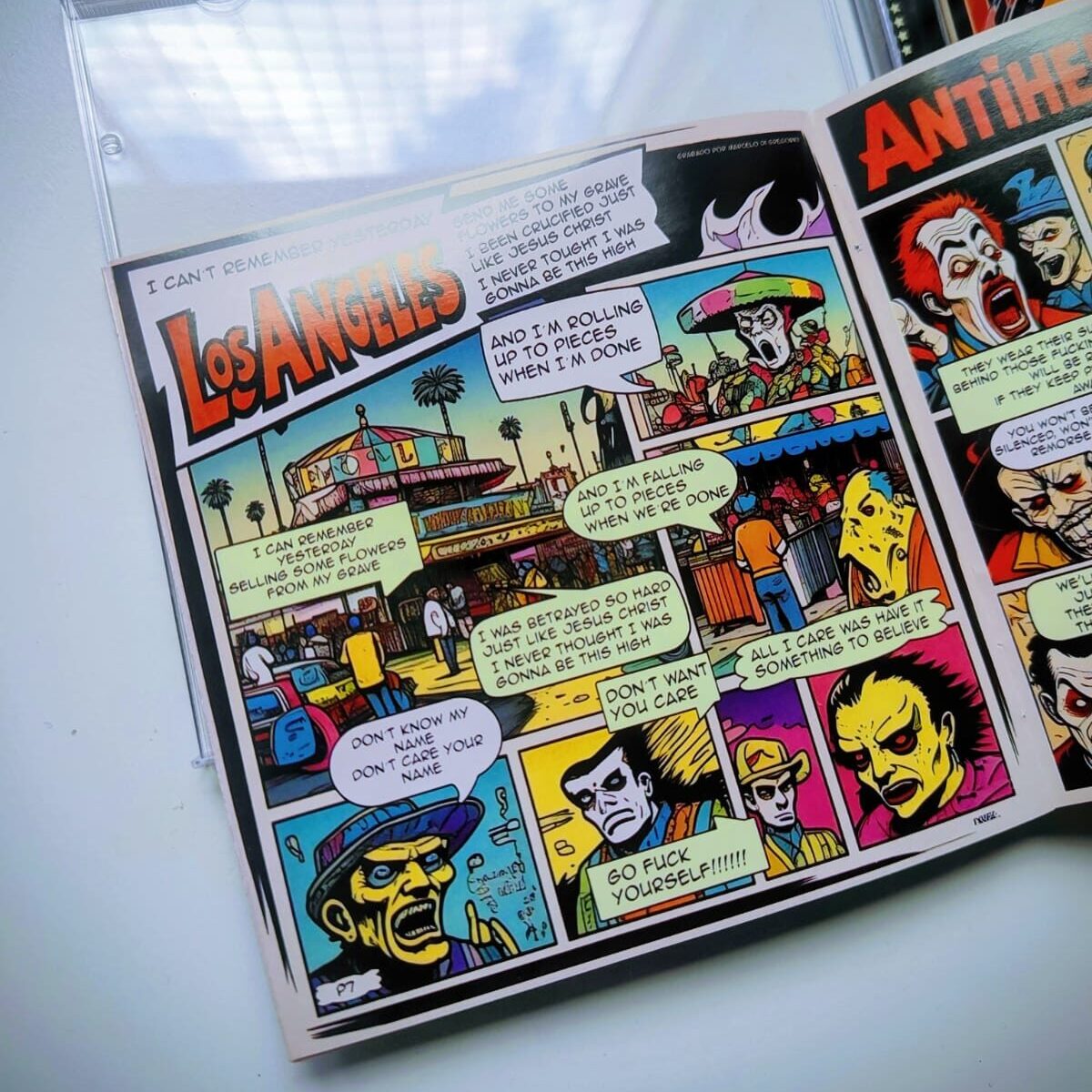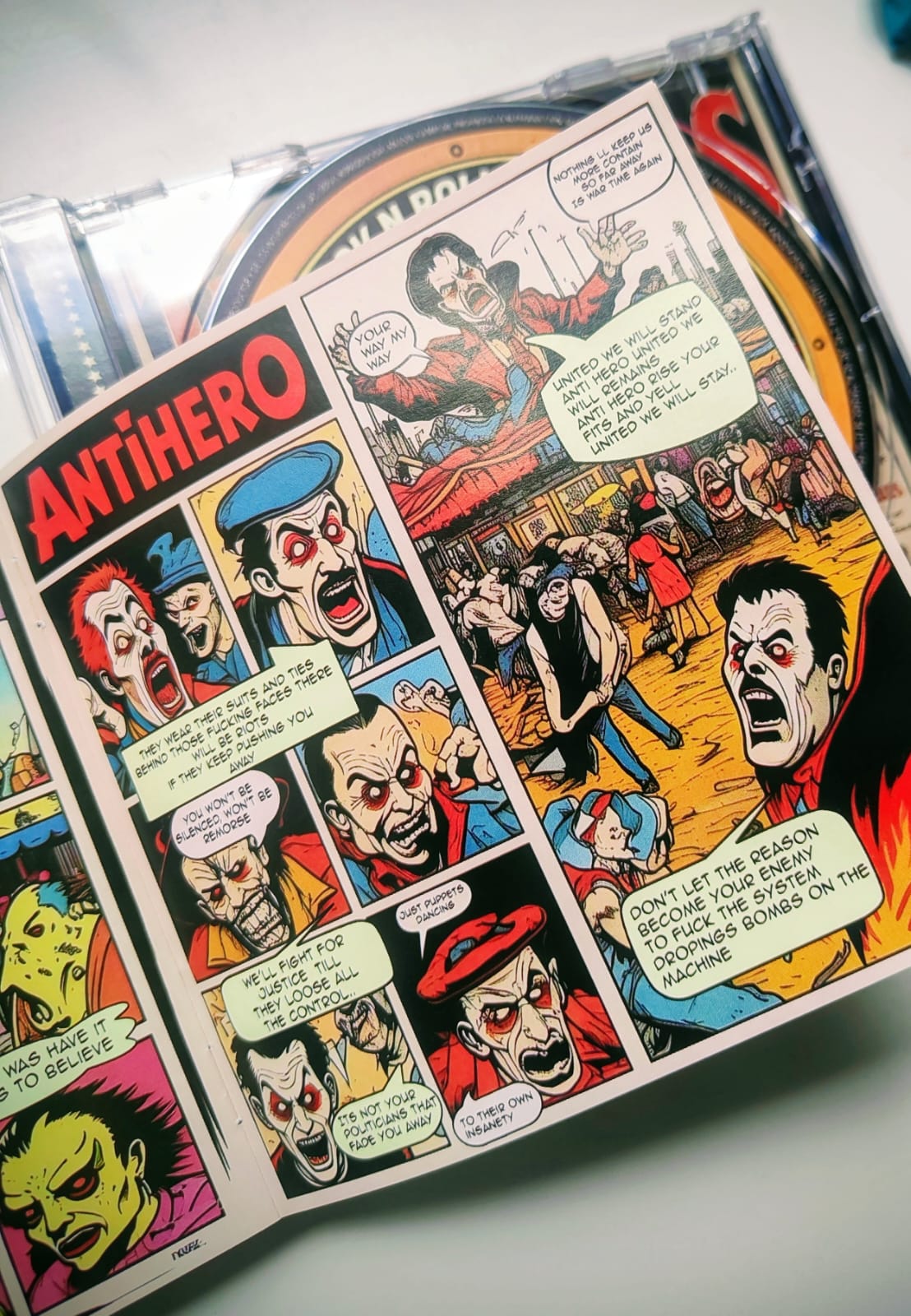 La propuesta es tan simple como peligrosa: riffs veloces, letras cortantes, una energía que parece empujar las paredes del estudio. Cada canción es una dosis medida con precisión: lo justo para mantenerte despierto, lo suficiente para hacerte temblar. El concepto se refuerza con el librito incluido en la edición física, un cómic que traduce en imágenes el mismo vértigo que la banda imprime en sonido. Las canciones no solo se escuchan: se leen, se ven, se encadenan como historietas de acción, sexo y redención, con estética pulp y colores saturados.